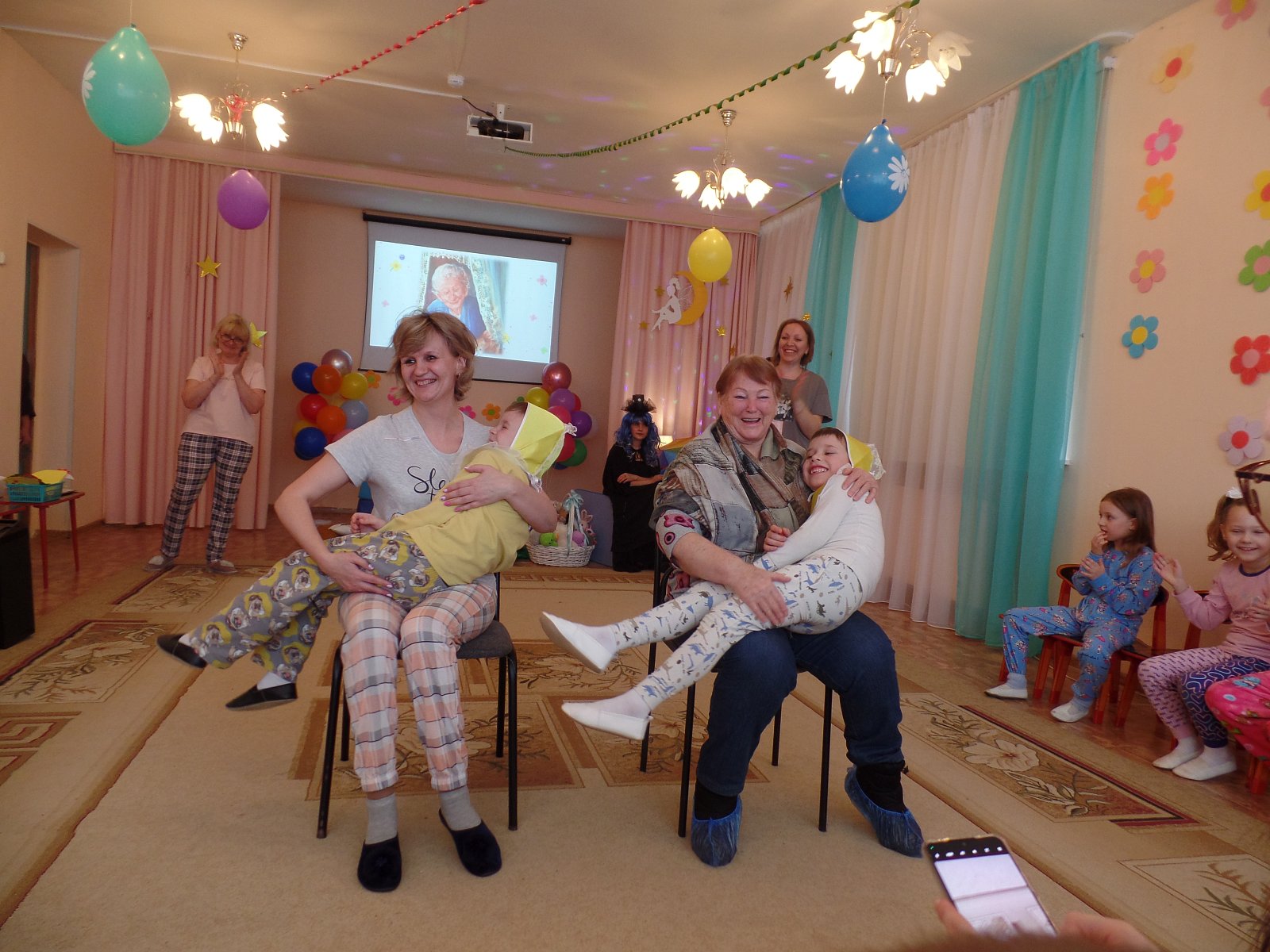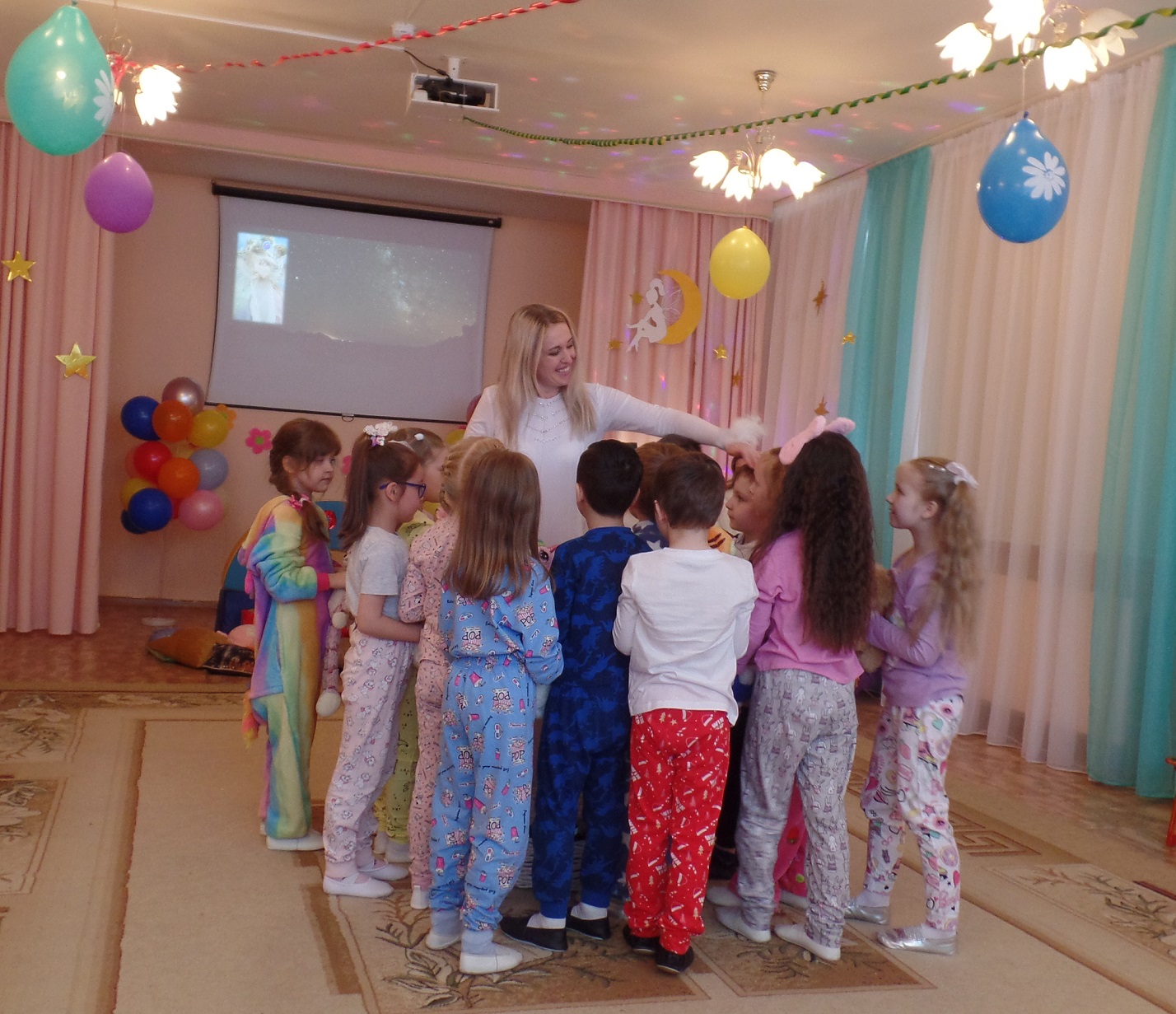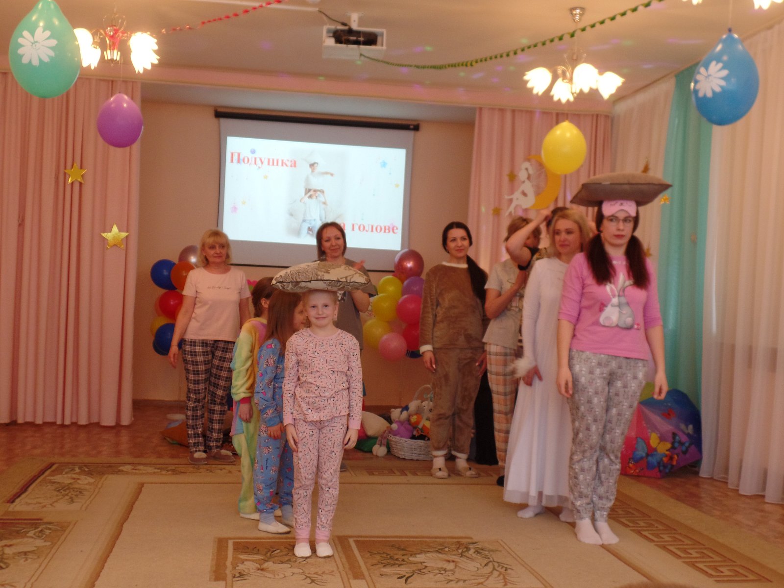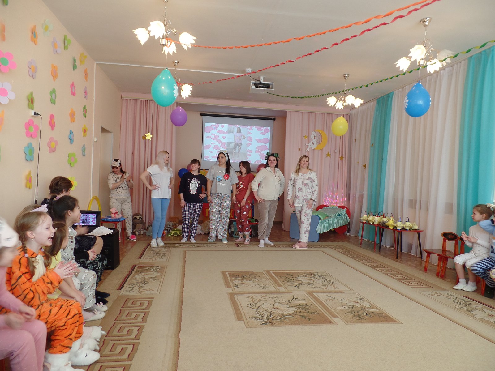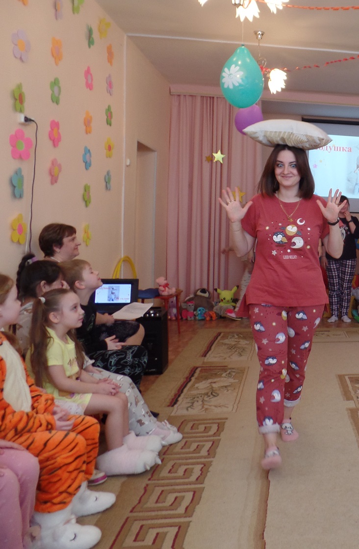 И предложили нашим мамочкам позабыть обо всех хлопотах и заботах и вместе с нами отдохнуть по-домашнему, пригласили их на пижамную вечеринку. Получилось весело и здорово. Мамы, бабушки и дети получили большое удовольствие от праздника и много положительных эмоций.