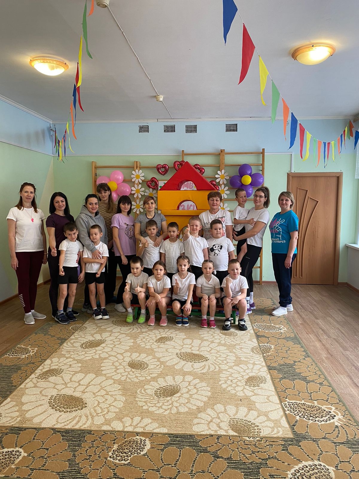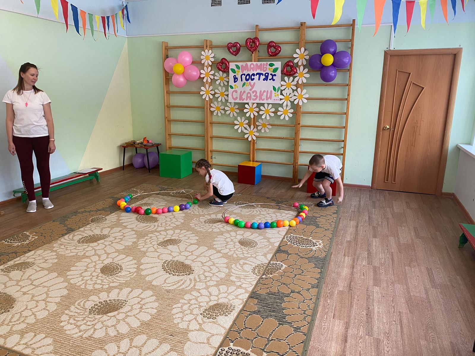 Инструктор по физической культуре О.Б. Качаева, воспитатели группы "Земляничка" А. К. Шилова , группы "Мотылёк" М.А. Еремеева и дети пригласили мам в гости к сказке.