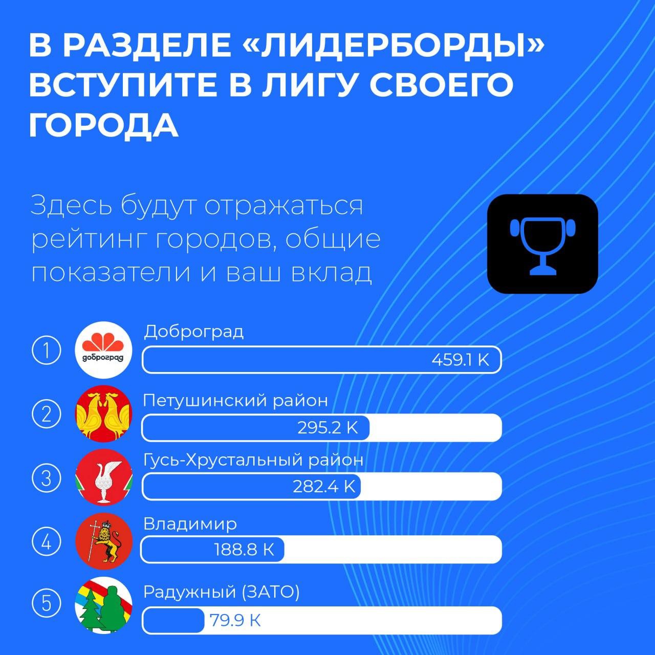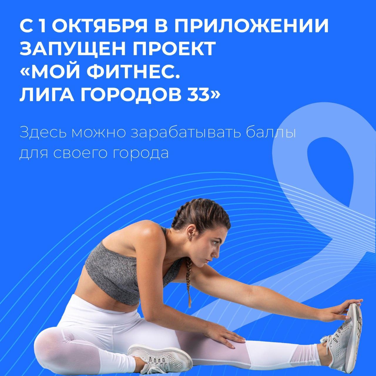 А в октябре стартовал проект «Мой Фитнес.Лига городов 33». Баллы всех участников программы из одного города суммируются и идут в общий зачёт отдельного муниципалитета. Тройка лидеров получит новые спортивные площадки от Правительства Владимирской области.